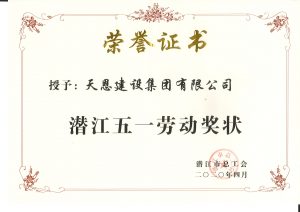 4月28日,天恩建設集團有限公司被潛江市總工會授予”潛江五一勞動獎狀”榮譽稱號。