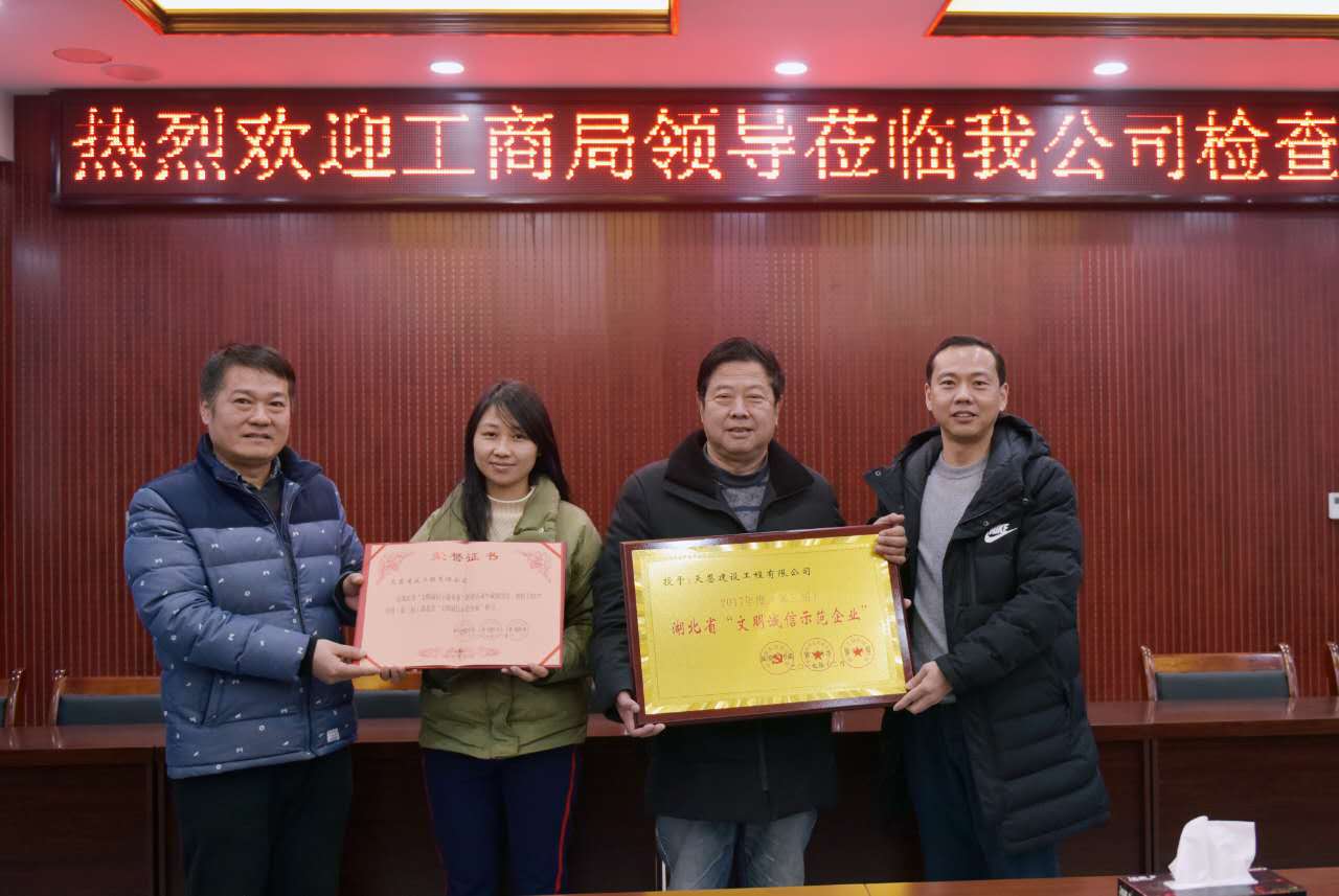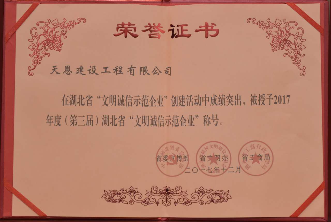在省委宣傳部、省文明辦和省工商局聯合開展的湖北省 “文明誠信示范企業”創建活動中,我司榮獲“湖北省文明誠信示范企業”稱號
