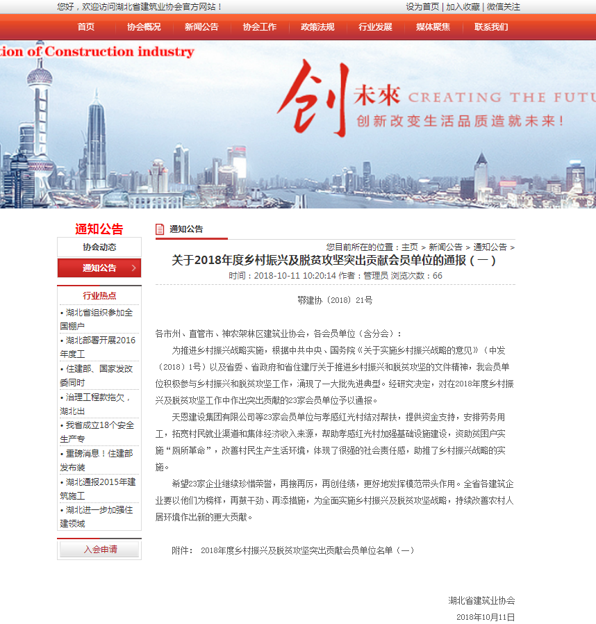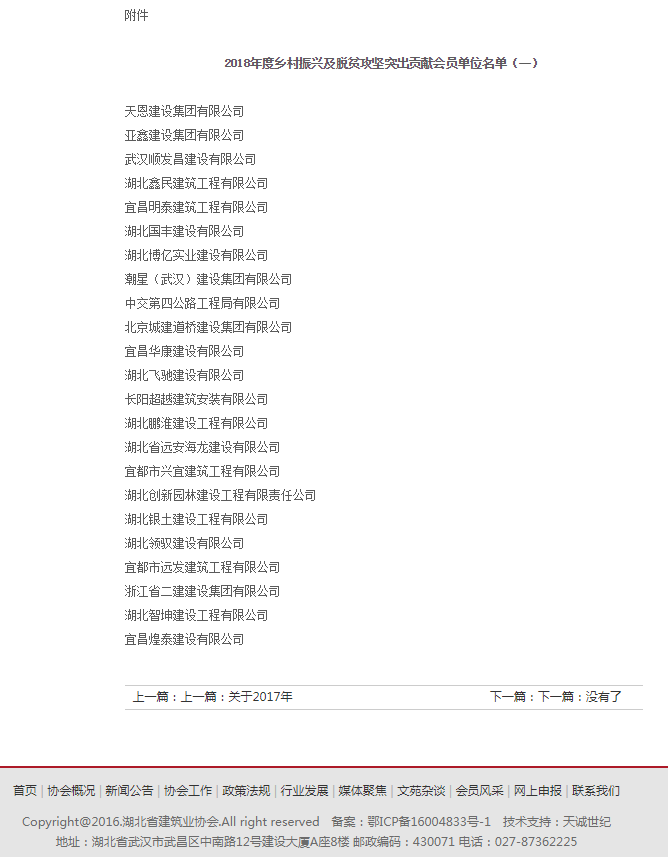 湖北省建筑業(yè)協(xié)會——關(guān)于2018年度鄉(xiāng)村振興及脫貧攻堅突出貢獻會員單位的通報